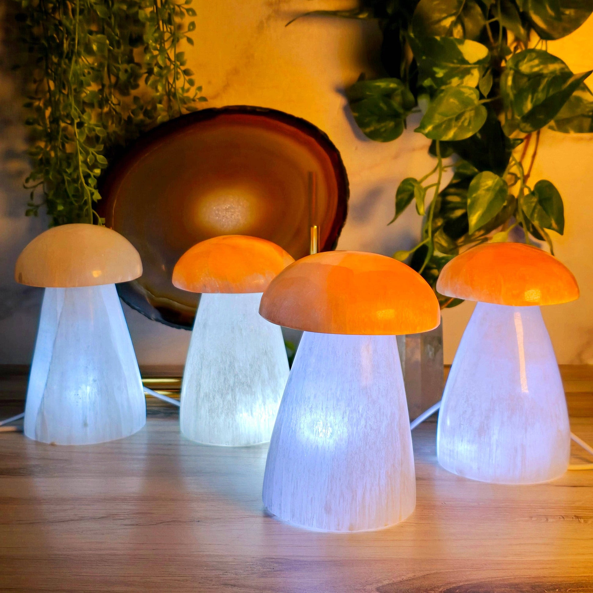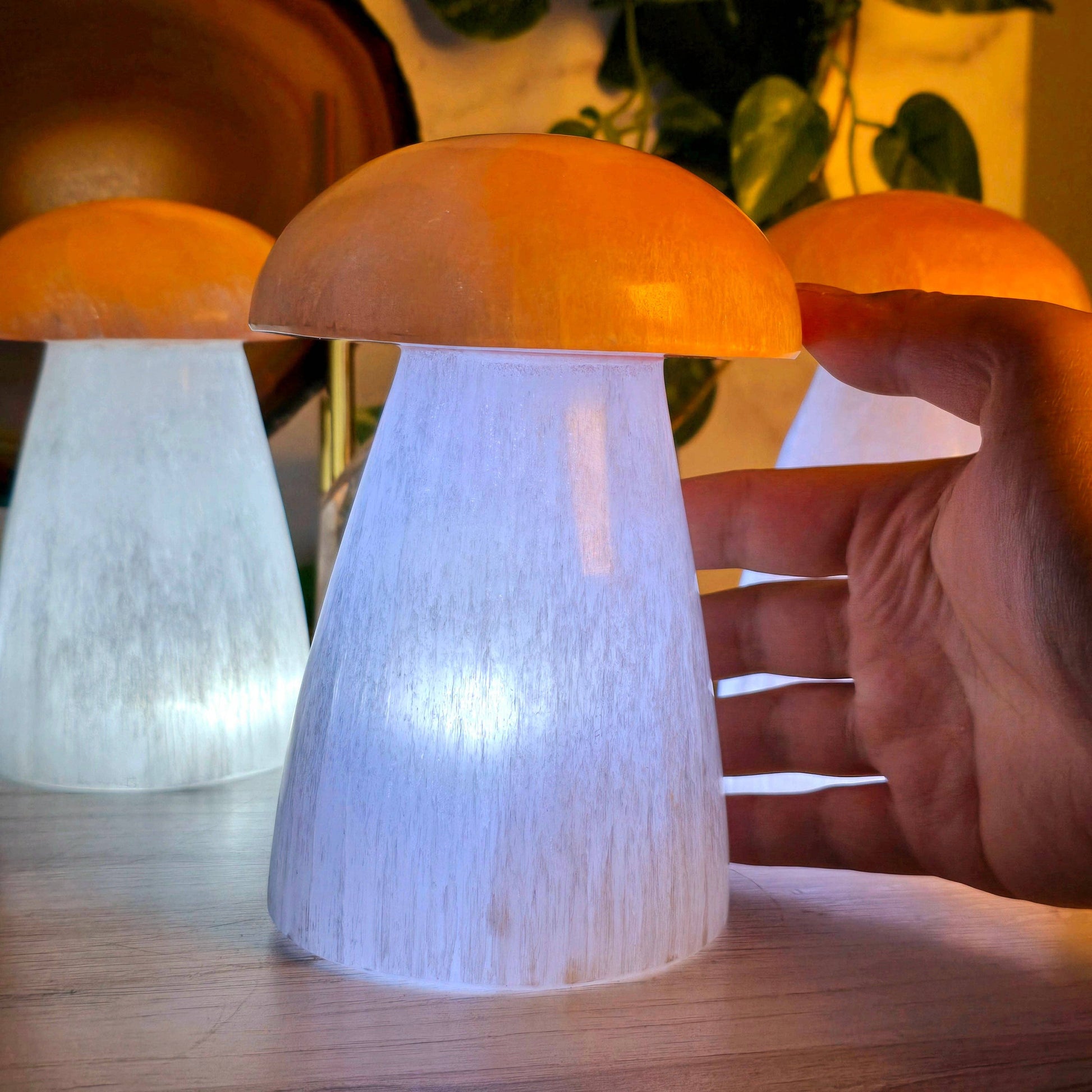 • Selenite Lamp: This selenite mushroom lamp has a white selenite stalk and orange selenite cap that light up when turned on.